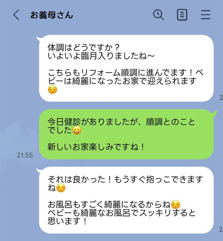 現在、義実家はリフォームしていてその話題になると必ず「ベビーを綺麗になったお家で迎えられる〜」「ベビーには綺麗なお風呂に入ってもらえる🛁」とベビーに繋げます👶🏻
