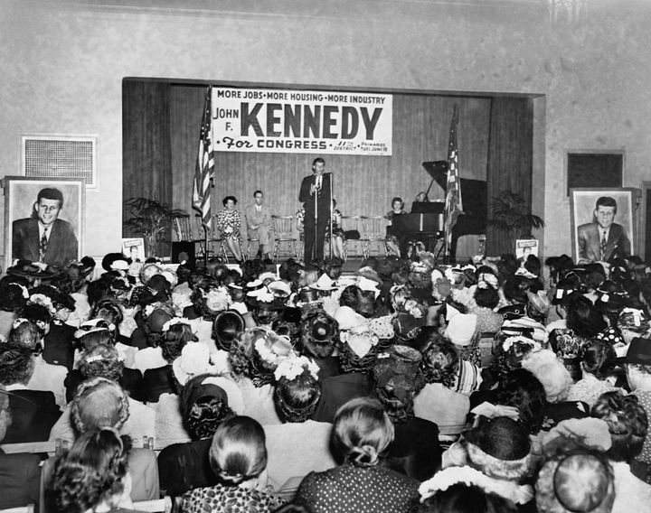 1946年7月、女性団体の前で下院議員候補として選挙運動について演説するジョン・F・ケネディ。 Historical / Getty Images
