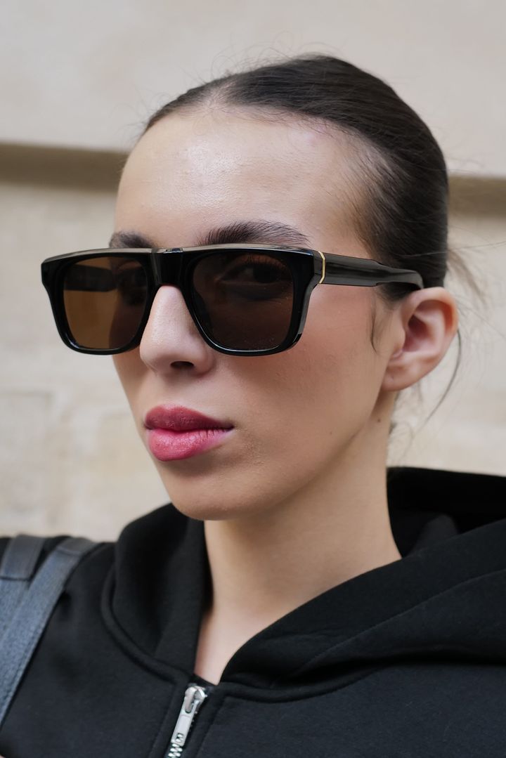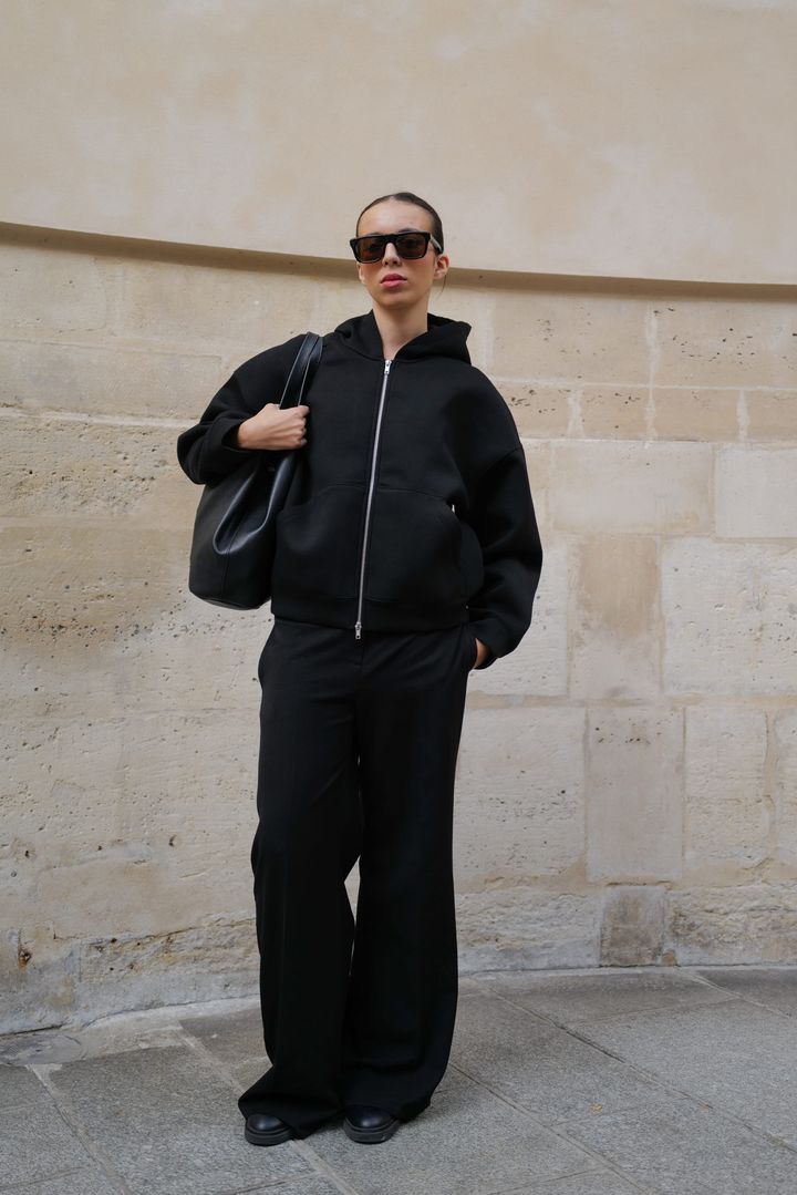 ワードローブの定番、シンプルな黒フーディー。ザジアはオールブラックで着こなすことでモードに昇華。ビッグフレームなサングラスをスパイスとして効かせて。