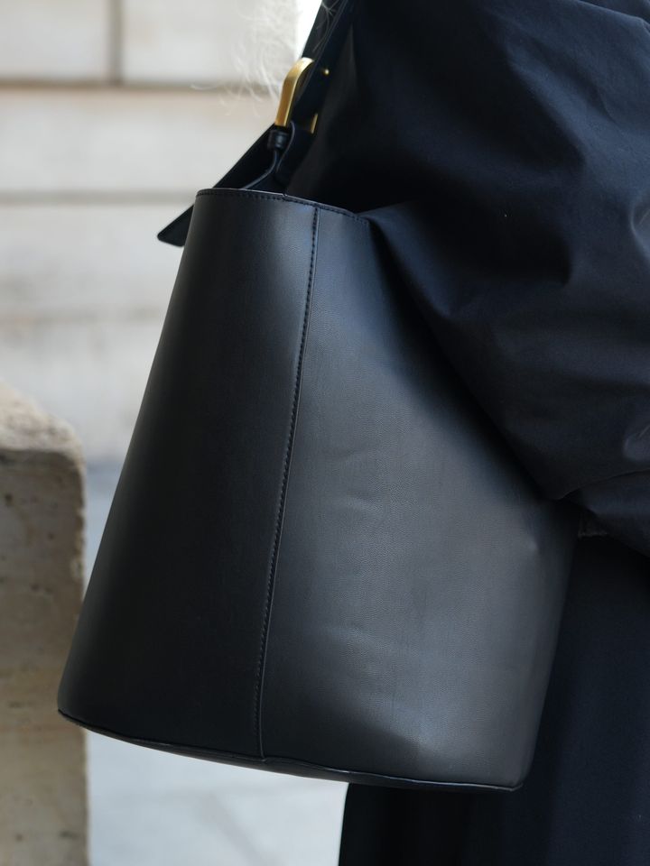 バケツ形のバッグは「H&M」でリーズナブルにゲット。ミニマルなデザインがコーデにマッチ。
