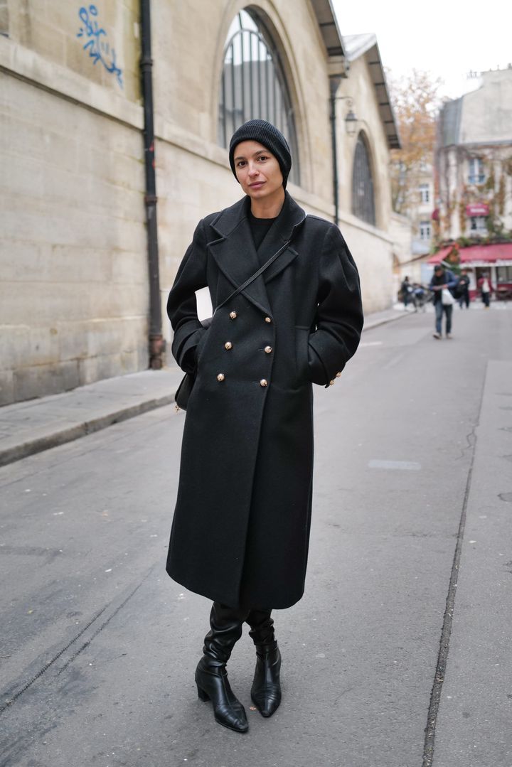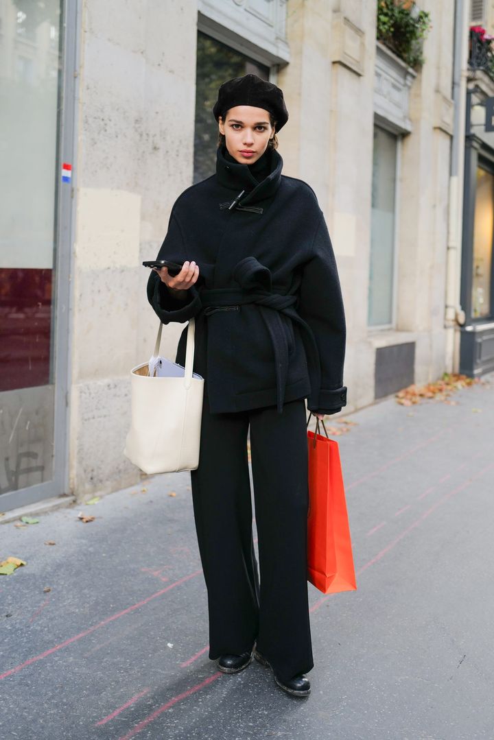 「ルメール」のスタンドカラーコートと「ザ・ロウ」のワイドパンツをコーディネート。エレガンスを感じる黒コーデにコーデュロイのベレー帽をプラスして、パリらしいエスプリを効かせていた。