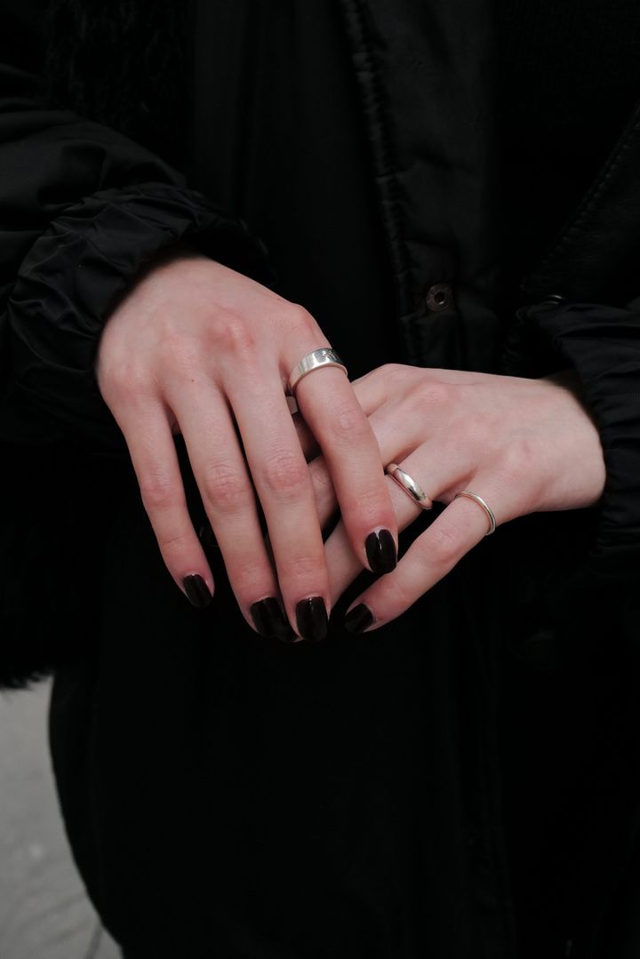 黒ネイルをあしらうことで、 モードな統一感を出して。ミニマルなシルバーリングも着こなしに映える。