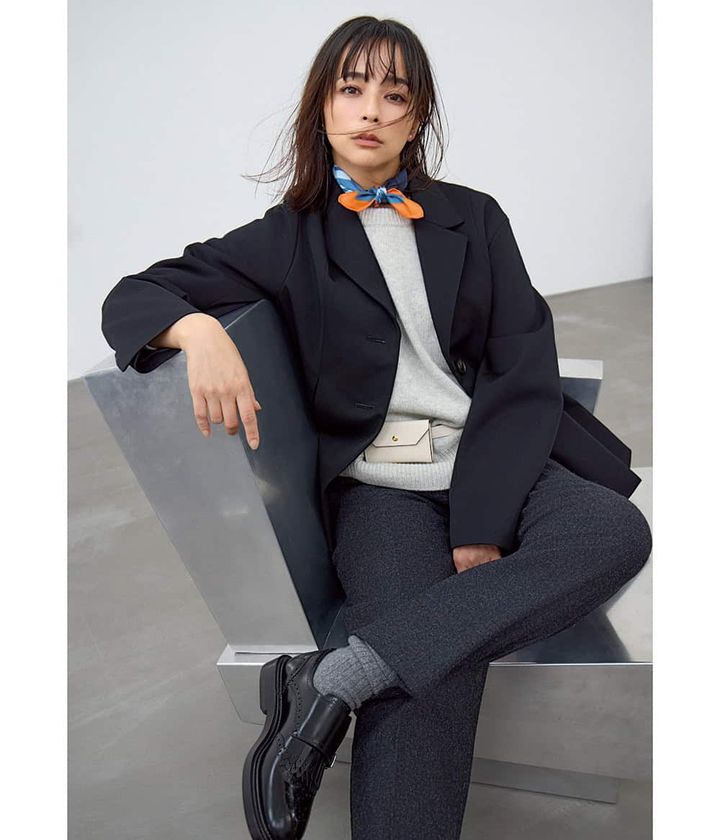 定番のブラックのジャケパンスタイルにヴィヴィッドなオレンジのチーフをアクセサリー感覚でポイントに。メンズアイテムを女性がつけても馴染むのはエルメスならでは。