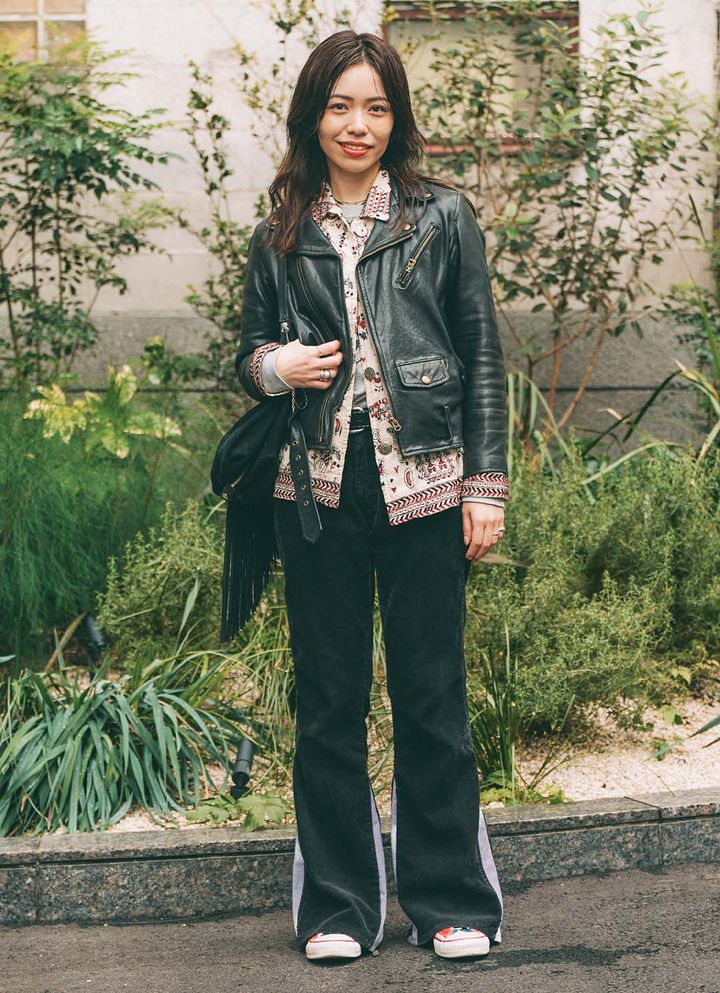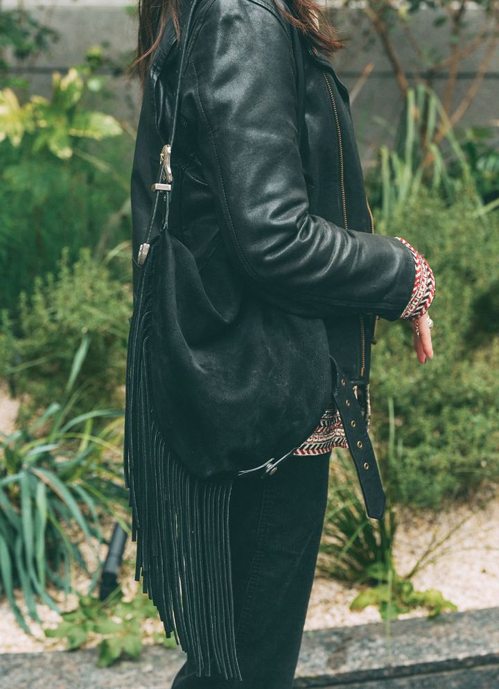 フリンジバッグがコーデに動きをプラスしてくれる。スウェードを選んで、レザージャケットとの素材のコントラストが映える装いに。