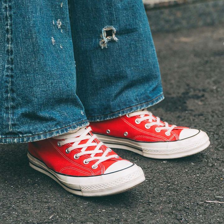 足元はレッドの『コンバース』スニーカーをオン。ヴィンテージライクなデニムとも好マッチ!