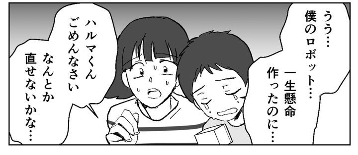 私たち夫婦が言い争っていると、ハルマが壊れたロボットを手に大粒の涙を流し始めました。