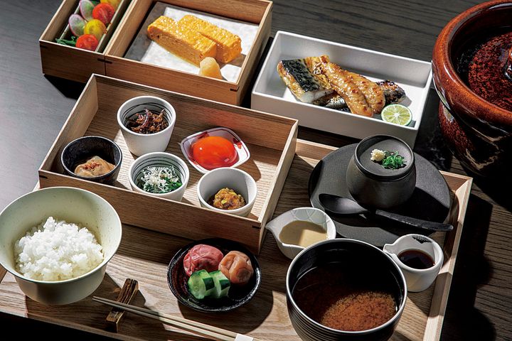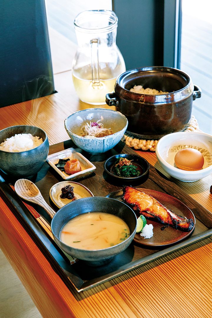 朝食は「ESHIKOTO」内のレストラン「アペロ&パティスリー アコヤ」で。土鍋で炊いた福井県産コシヒカリにふくい名水サーモン、へしこ、蔵囲昆布など、地元の味でパワーチャージ!