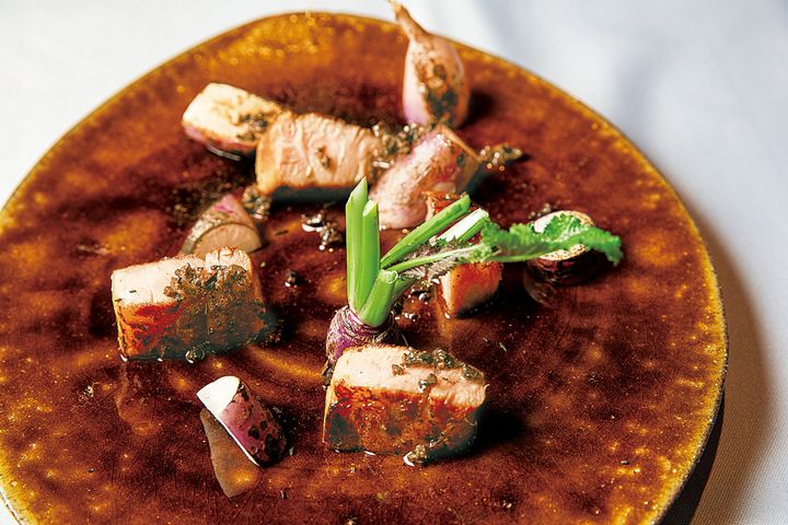 表面をさっと焼いたカブの瑞々しさと豚の脂の甘みが引き立て合う「庄内豚のグリル」。