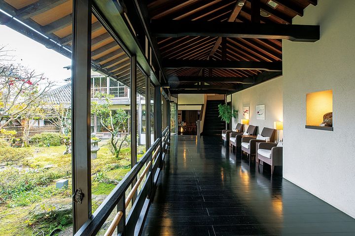 宿の中庭を望む廊下は和モダンな佇まい。