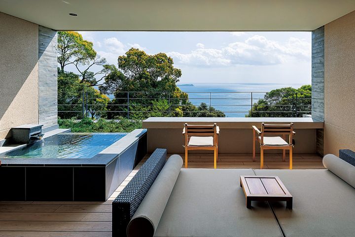 (写真)客室はホテル棟に15室、離れのヴィラが3棟、全てオーシャンビューの温泉露天風呂付き。小学生以下は利用不可なので、落ち着いた大人の時間が過ごせます。