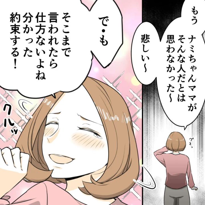 「もう、ナミちゃんママがそんな人だとは思わなかった~。悲しい~。」私に背を向け、まるで悲劇のヒロイン気取りで鼻をすするハルちゃんママ。次の瞬間、私の方へクルッと振り向くと、「でも、そこまで言われたら仕方ないよね、分かった約束する!」と満面の笑みを浮かべたのでした。要求したものが手に入ったので満足なのでしょう。