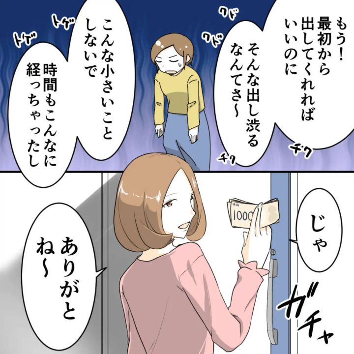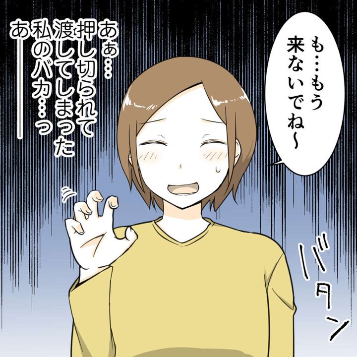 「も、もう来ないでね~」なぜか笑顔で、ハルちゃんママを見送りました。あぁ、結局押し切られて渡してしまった・・・私のバカ。冷静になってから五千円も渡してしまったことを思い返し、じわじわと後悔が押し寄せてきました。でも、一応知り合いだし、これで渡さなかったら、色々なところで陰口を言われてしまう可能性のほうが高い。私は基本的に会うことは少ないけれど、家の近くには娘の同級生も住んでいるし、子どもに何かあっても困る。