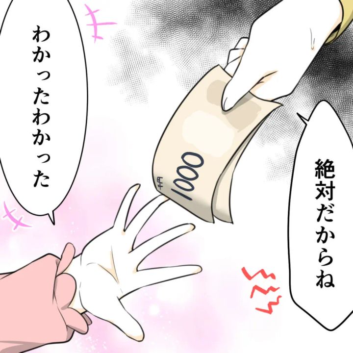 「絶対だからね」私は念を押しました。もう何を言われようと、これで厄介払いができるなら構わない。そう自分に言い聞かせ、さらに追加で二千円をハルちゃんママに渡します。ハルちゃんママは「わかったわかった」と上機嫌でそのお金を受け取りました。