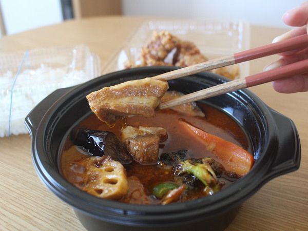 こちらのカレーは辛さは0番から50番まで選べます(0〜20までは無料)。初めて訪れたので、私は辛さ2の「豚角煮&ベジタブルスープカリー」と「北海道名物鶏ざんぎハーフ(5個入り)」を購入しました。