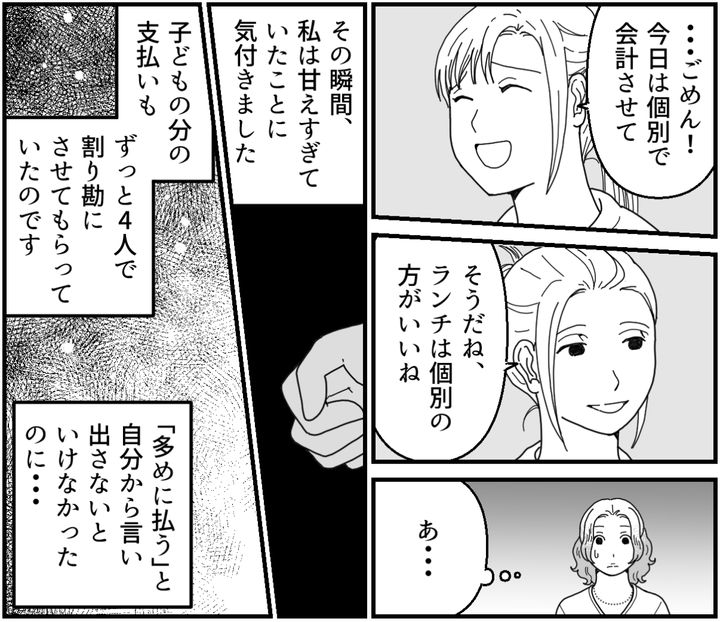 けれどその日「お会計は個別で」と言われた瞬間、みんなに甘えすぎていたことに気付きました。私は当たり前のように割り勘しようとしていたのです。飲み会でももっと早く、自分から「多めに払う」と言い出さないといけなかったのに……。