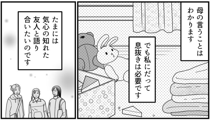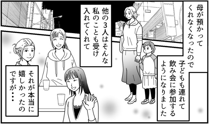 私はマユコ。20代前半で結婚して、5才の子どもが1人います。元旦那とは少し前に離婚しました。なにかにつけて罵倒してくる人だったから、今は別れてむしろスッキリしています。つらい時期に悩みを聞いてくれた学生時代からの友人、アンナ、エリ、ネネには感謝しています。しかし困ったことがひとつ。うちの母が子どもを夜預かってくれなくなったのです。子ども抜きでの気心知れた友人4人での飲み会は、私にとって大切な場だったのに……。