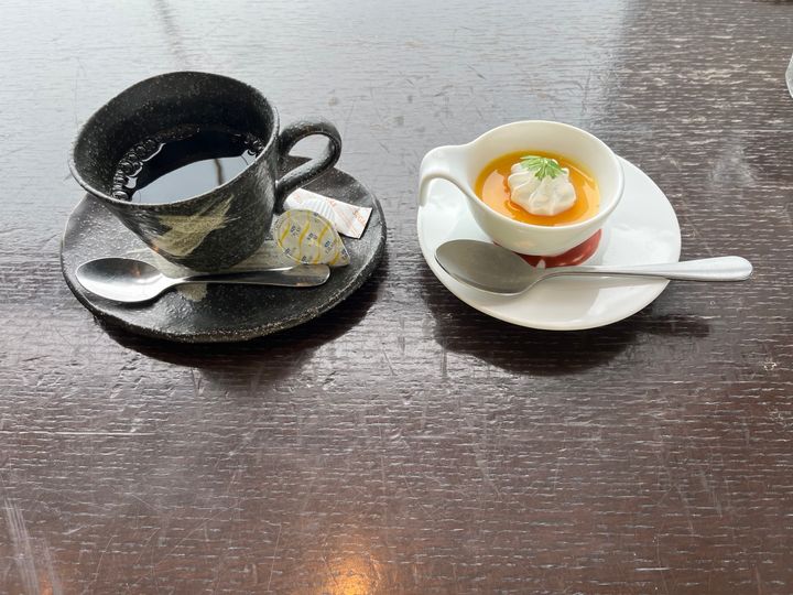 プリンはとっても濃厚で、クリームとよく合います。コーヒーもステキな器で提供されました。