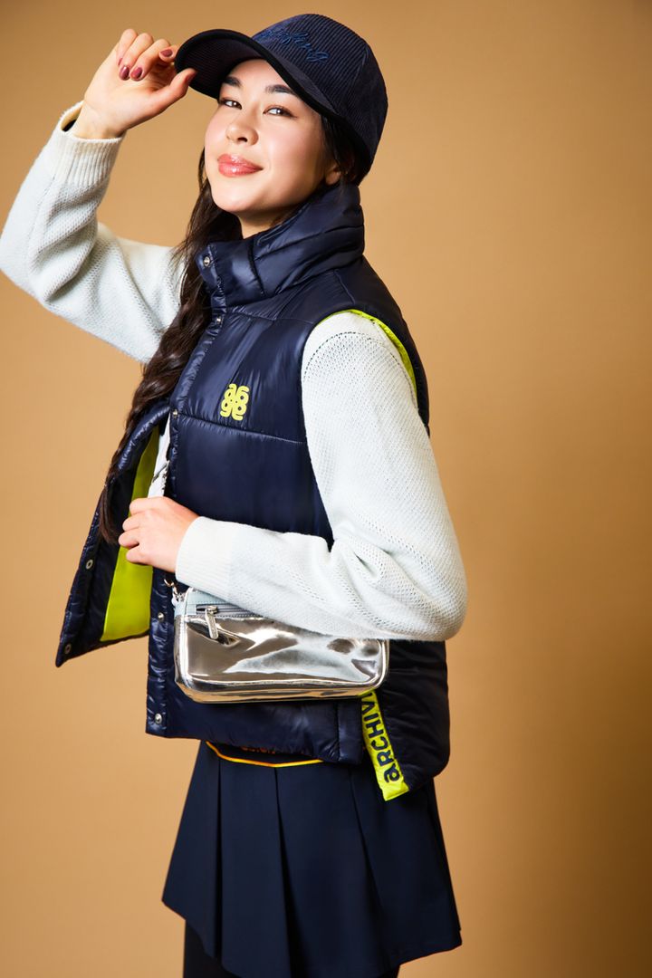 ベスト¥53,900、ニット¥36,300、スカート¥39,600(以上アルチビオ/ビキジャパン) キャップ¥9,350(ブリーフィングゴルフ/ブリーフィング 六本木ヒルズ店) バッグ18,150円(レスポートサック) トレンカ¥2,750(靴下屋/タビオ)
