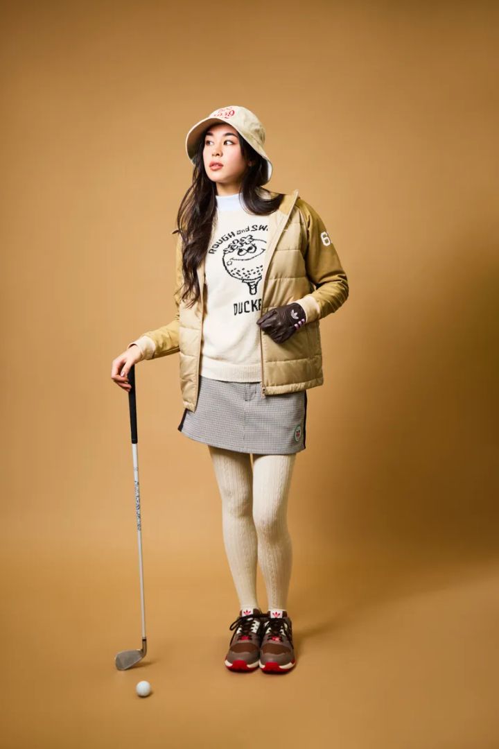 アウター¥33,000、ニット¥24,200、スカート¥22,000(以上ラフアンドスウェル/フーリッシュ) 中に着たスナップシャツ¥13,200(ジャックバニー!!) バケットハット¥4,620(ピン/ピンゴルフジャパン) タイツ¥3,080(靴下屋/タビオ) シューズ¥19,800(アディダスゴルフ/アディダス ゴルフお客様窓口)
