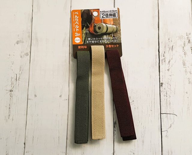 ダイソーで購入できるべんりベルトを紹介。留めたいものに合わせて幅や長さを選べます。