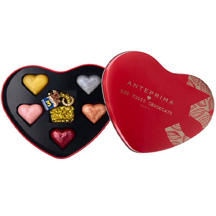 「レ トロワ ショコラ パリ」は、パリ・マレ地区に店を構えるショコラトリー。オーナーの佐野恵美子氏が、日本とフランス、それぞれの食文化を融合させた、繊細で華やかなチョコレートを手がけている。今回は、「アンテプリマ」と「レ トロワ ショコラ パリ」のロゴが描かれたハート型の缶に、5種類のハート型チョコレートを詰め合わせに。フランボワーズとライチのジュレに、いちごとフランボワーズのガナッシュを重ねた「ライチフランボワーズ」や、マスカットのジュレにマダガスカル産カカオとレモンのガナッシュを合わせた「マスカットレモン」など、フルーティーでみずみずしい味わいのフレーバーがそろう。さらに中央には、「レ トロワ ショコラ パリ」のロゴ入りのチョコレート型メタルチャームを組み合わせた「アンテプリマ」のミニミニワイヤー付き。バッグチャームとしても楽しめそうだ。