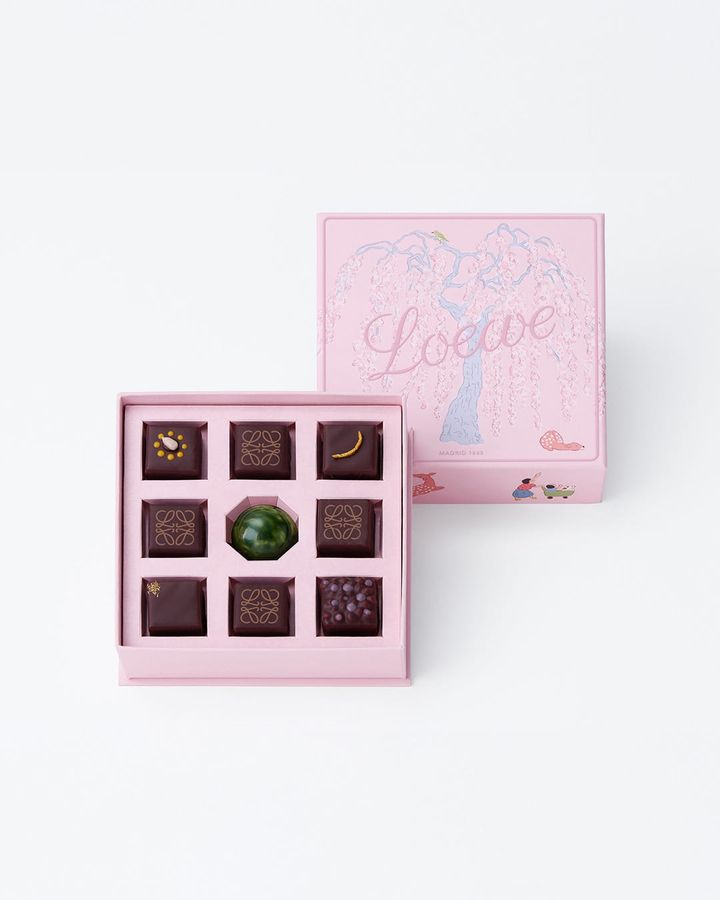 「アトリエ パージュ」は、パリの一つ星レストラン「レストラン パージュ」のシェフ・手島竜司氏が、京都に構えたスイーツブランド。焼き菓子やジェラート、チョコレートなどを通して、フランス菓子のエスプリを発信している。今回のコラボレーションでは、「ロエベ」のブランドルーツを体現すべく、厳選したスペイン食材を使用。クラシカルな佇まいの中に遊び心を忍ばせたアレンジで、パリから直輸入された特別なチョコレート ボンボンを仕立てている。ラインナップは全9種。香ばしいひまわりの種のプラリネや、スペイン産アーモンドのプラリネにスモークパプリカを合わせたもの、サングリアをイメージした一粒など、奥行きのある味わいがそろう。ボックスには、「スナ・フジタ」が描く枝垂桜の周りで動物や子どもたちが遊ぶ情景をデザイン。春の訪れを感じさせる、詩情あふれる佇まいも魅力だ。