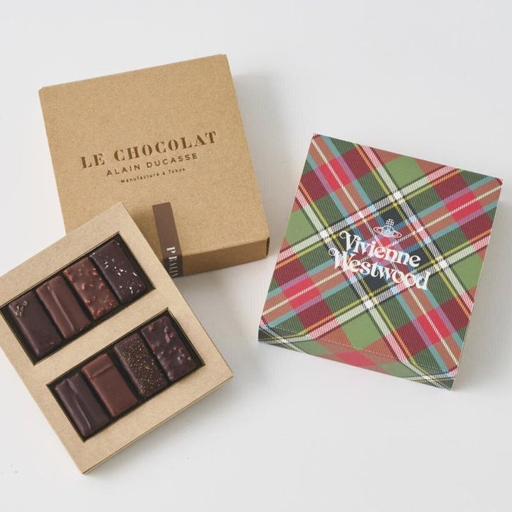 2025年9月に東京・青山に初の旗艦店をオープンし話題を集めた「ヴィヴィアン・ウエストウッド」。バレンタイン限定アイテムとして、フランス料理界を代表するシェフ、アラン・デュカス氏が手がけるショコラ専門店「ル・ショコラ・アラン・デュカス」とのコラボレーションが実現した。アソートには、アーモンドやヘーゼルナッツ、ココナッツ、ピスタチオなど、素材の個性を生かした定番のプラリネ「プラリネ・ア・ランシエンヌ」6種に、バレンタイン限定のフレーバー2種を加えた全8種を詰め合わせに。