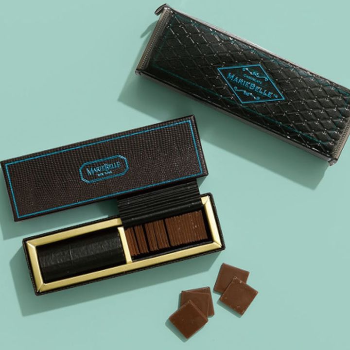 ショコラは、ベトナム産のカカオ38%のミルクチョコレートに、ゲランドの塩を合わせた「フィンデショコラ ミルク38% フルール・ド・セル」。やさしい甘みの中に、塩味がふわりと立ち上り、口の中で心地良いコントラストを描く。薄く仕上げた一口サイズのタブレットは、舌で甘さや塩味をダイレクトに感じられるのも魅力だ。さらに注目したいのが、「ビューティフルピープル」で人気のPVC素材を用いたポーチ。「マリベル」のデザインを落とし込んだシックな佇まいで、ペンケースや眼鏡ケースとしても活躍する。