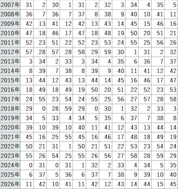 45(上の表から算出)+ 26(生まれた日)=71 → 干支番号は「11」