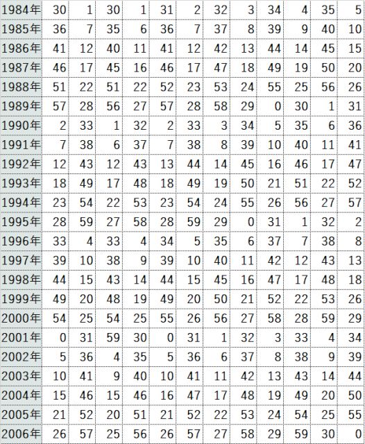 1. 下の表から「自分の生まれた年」と「自分が生まれた月」が交差する数字を出します。