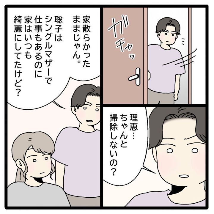 その後、電話が終わりまたリビングに戻って来た正志に、「理恵・・ちゃんと掃除しないの?」と指摘したかと思うと、「家散らかったままじゃん。聡子はシングルマザーで仕事もあるのに、家はいつも綺麗にしてたけど?」と嫌味を言い出しました。