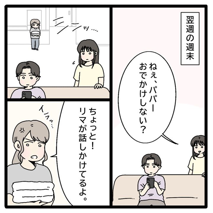 「ねぇ、パパー。おでかけしない?」リマがそう声をかけてもスマホに夢中で何も答えない正志。洗濯物を片づけていた私はそれを見てイライラし、「ちょっと!リマが話しかけてるよ」と正志に言いました。