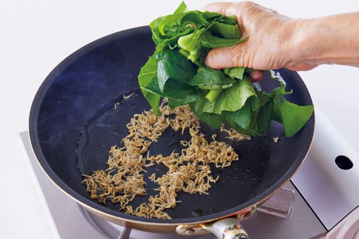 (2)フライパンにごま油を中火で熱し、じゃこを入れて1分炒める。小松菜を加えて炒め、しんなりとしたら、酢、しょうゆで調味する。