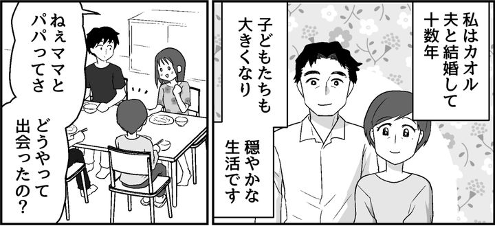 私はカオル、40代のパート主婦です。20代半ばで夫と結婚し、現在は娘と息子と4人で暮らしています。子どもたちが大きくなり、ここ数年は精神的なゆとりも出てきました。そのため子育て真っ最中のときにはなかなか会えなかった学生時代の友人と、連絡を取り合って会ったりもしています。バイト仲間だったエイコもその1人です。そんなある日、家族と食卓を囲んでいると……。私のなかに大学生当時の思い出が鮮やかによみがえってきました。