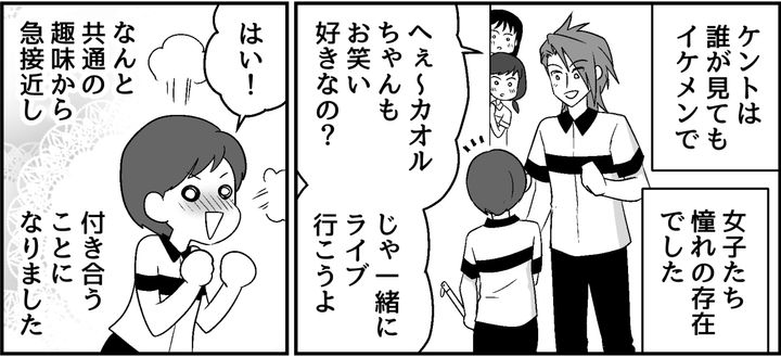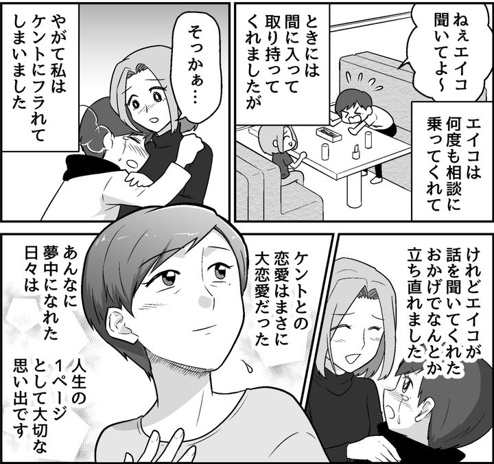 家族で食卓を囲んでいるとき、子どもから夫との出会いのきっかけを聞かれました。私は「大恋愛」という言葉に、大学時代に心を奪われたケントとのことを思い出します。明るくカッコいいケントに夢中になった私は、嫉妬や不安に揺れながらも、ますますケントに夢中になっていったのです。最終的には私がフラレてしまったのですが、親友エイコの支えでなんとか立ち直ることができました。