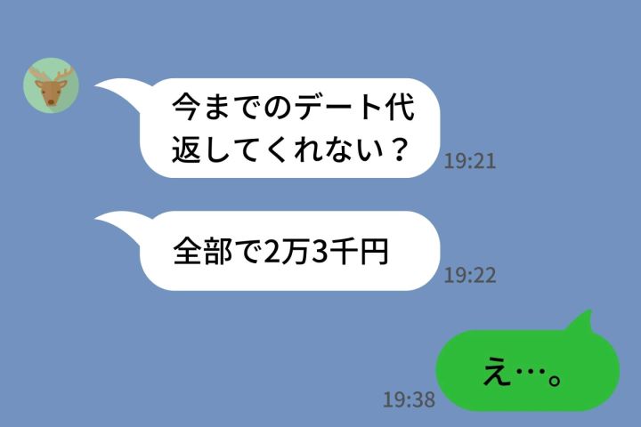ところが翌日、信じられないLINEが届きました。「今までのデート代返してくれない?全部で2万3千円」目を疑いました。続けて「僕がおごってあげた分、ちゃんと計算したから」と追い打ちのメッセージ。私は怒りを通り越して、呆れてしまいました。