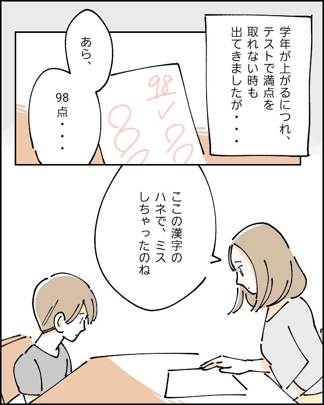 「あら、98点・・ここの漢字のハネでミスしちゃったのね」ある日、返された国語のテストを見て、マイナスされた2点のミスを指摘した私は、