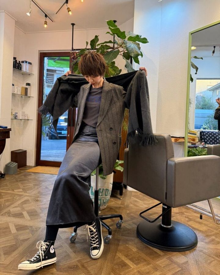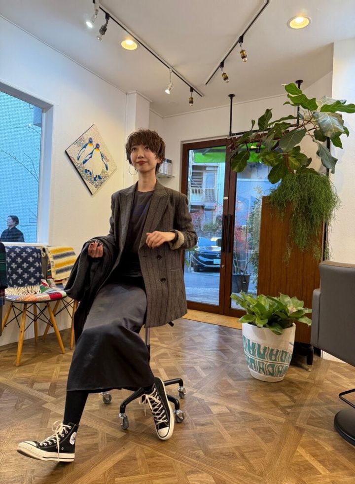 「タイトスカートは、季節やテイスト問わずに使いやすい万能アイテム。今回はロゴニットとブラウザジャケットで、今季らしくカジュアルダウンしてみました! ストールやユニクロのソックスは、防寒にもオシャレにも活躍♪ 特にストールは、室内では膝掛けとしても使えて便利なんです」(美容師・丸岡奈央さん)