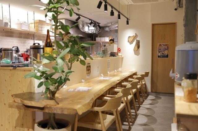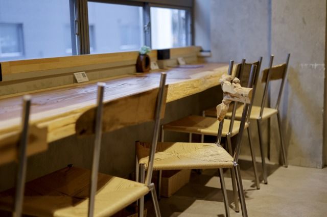 1階には厨房の前に配した巨大な一枚板のカウンター6席と4人掛けのテーブル席が2卓用意されています。カウンター席は、目の前で「おにぎり人」がおにぎりを握る姿も見られ、より一層楽しめます。