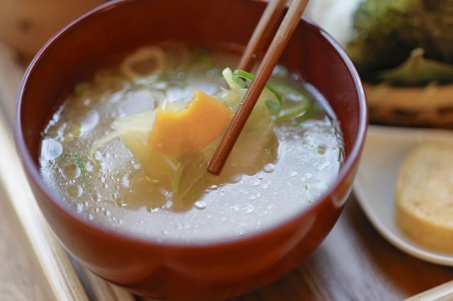 なんといってもおすすめなのが味噌汁です。大きな大根やニンジンがたっぷり! この味噌汁だけでも十分なおかずです。