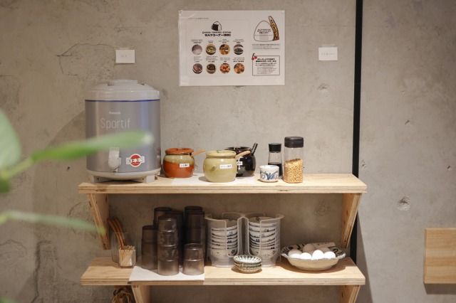 さらに見逃せないのが、無料の「ご飯のお供コーナー」(1・2階どちらにも設置)。だし茶漬け用のだしや卵かけご飯用の生卵、しば漬け、塩昆布やあられなどが設置されており、自分好みのテイストに自由に仕上げることが可能です。