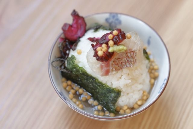 今回は鯛の刺身をおにぎりの上にのせ、しば漬けやあられ、わさびをトッピングします。