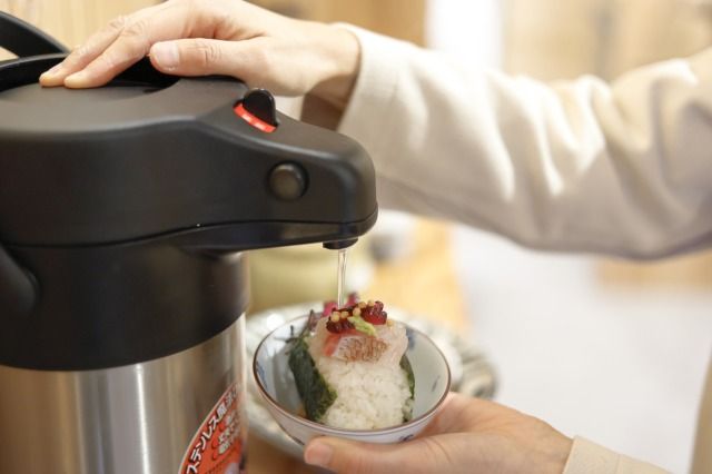鯛茶漬けといっても主役はおにぎり! だしがなじんで、ご飯のお供とともにおにぎりの味わいを楽しめる一品です。