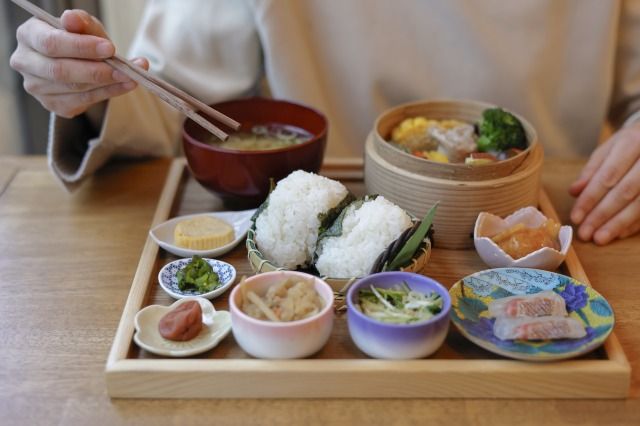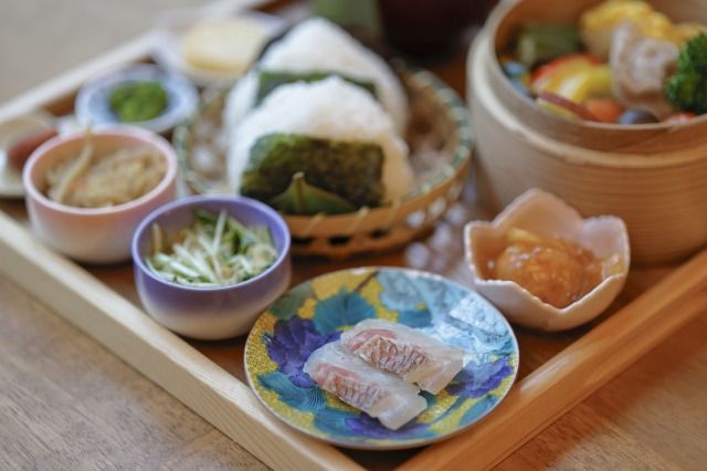 メインのおにぎりを取り囲むように並ぶのは、季節感や栄養バランスが考えられた色とりどりの小鉢。