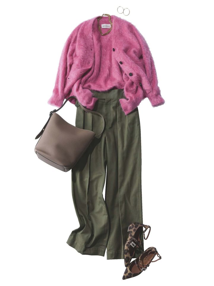 控えめだけどキャッチーなくすみ色カーディガン。シャギー素材と一緒ならオバ見え回避バッチリです。コーデを渋色で統一するとシックな華やかさが特徴的な個性派スタイルが出来上がります。