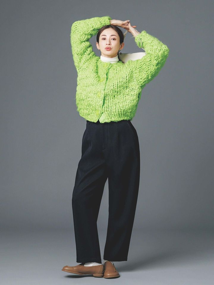 パッと映える鮮やかなライトグリーンは、エネルギッシュなほどのインパクトがなによりの魅力。ザクザクな網目の遊び心から高揚感まで獲得。派手色トップスの日は、パンツをコンサバにするのがポイントです。