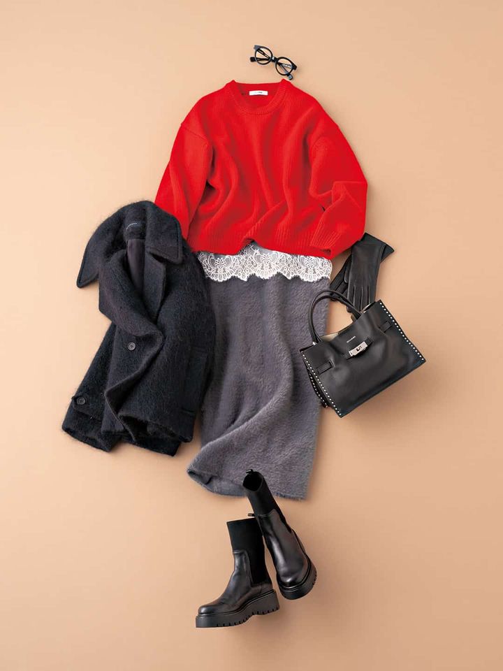 今年いちのトレンドカラー、「赤」。鮮やかな色味は、白レースを挟んでコントラストを和らげるのがコツ。旬度もぐっとアップします。グレースカートと相まって穏やかに好転。 スカート¥35,200ニット¥46,200(ともにスローン/ザ ショップ スローン新静岡セノバ店)レースカットソー¥19,800コート¥72,600(ともにマルティニーク/マルティニーク ルミネ横浜)バッグ¥46,200〈ヴィオラドーロ〉ブーツ¥34,100(ともにアルアバイル)メガネ¥71,500(アイヴァン 7285/アイヴァン 7285 トウキョウ)グローブ¥49,500(デンツ/真下商事)