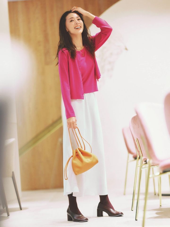 フルーティーなショッキングピンクは、実は2026年の開運カラー。持ち前の鮮やかさから肌トーンまで自然と明るく仕上げてくれます。白スカートをあわせて旬要素を取り入れたい。