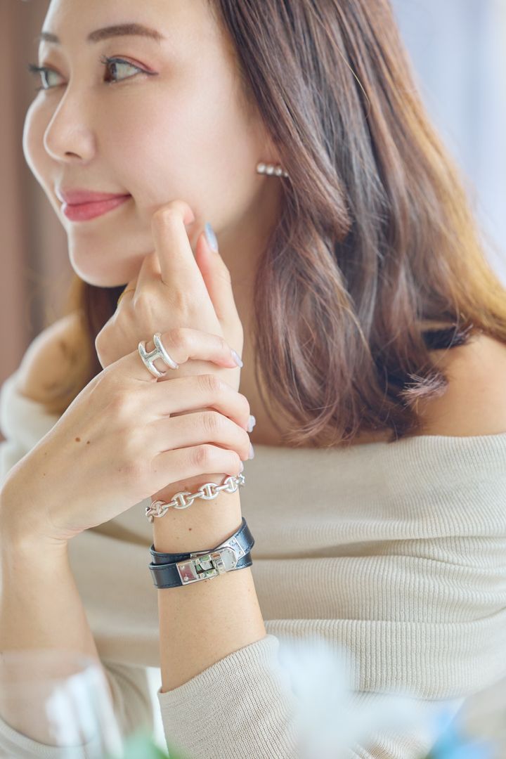 バングル、ブレスレット、リングをエルメスで統一。シャープでクールなデザインが私らしいなと思い、コレクションしています。TASAKIのピアスは体調を崩して落ち込んでいる時に、夫がプレゼントしてくれた思い出の品。パーソナルカラーがブルべ冬なので、シルバーカラーのアクセが青み肌をキレイに見せてくれる気がします。