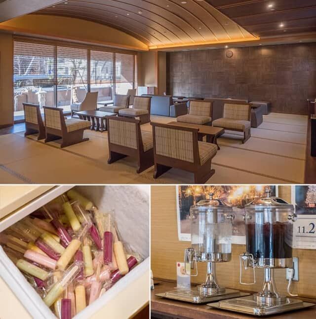 大浴場の入口には、広々した畳敷きの湯上り処があって、のんびりと過ごせます。アイスキャンディーや水、北海道ならではのハスカップ水が用意され、入浴前後の水分補給に利用しました。